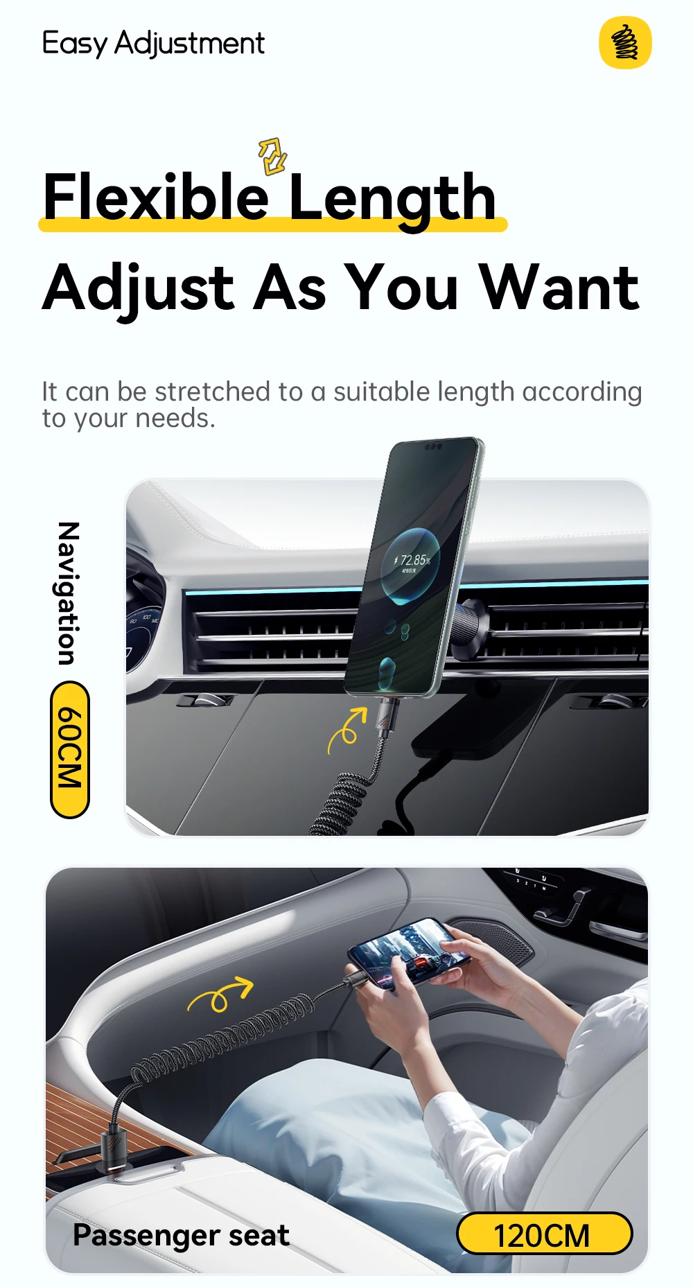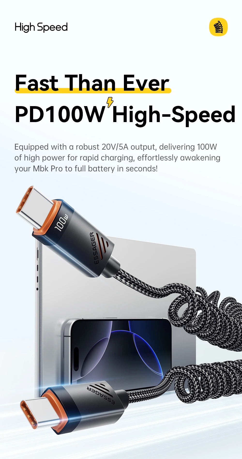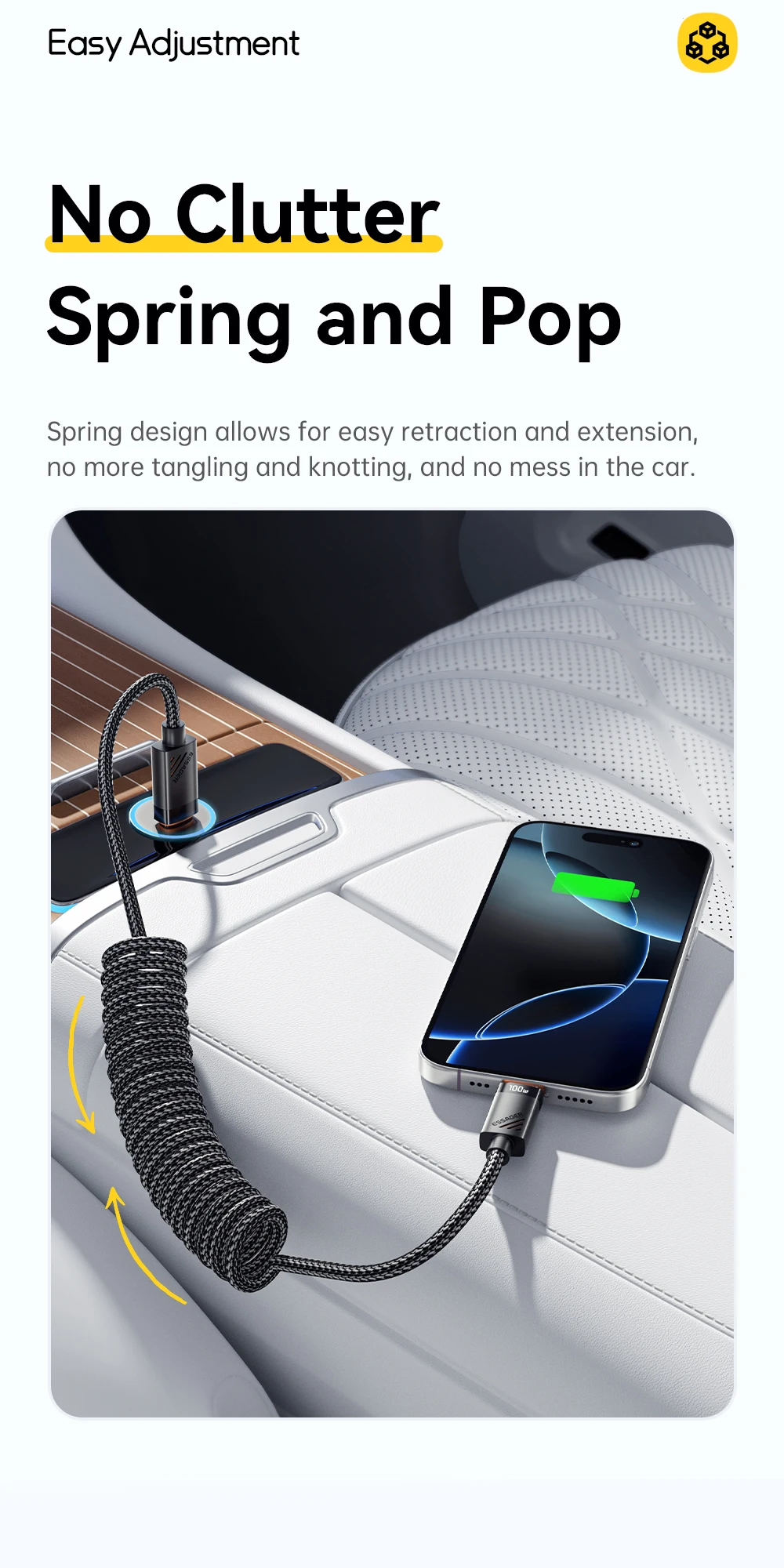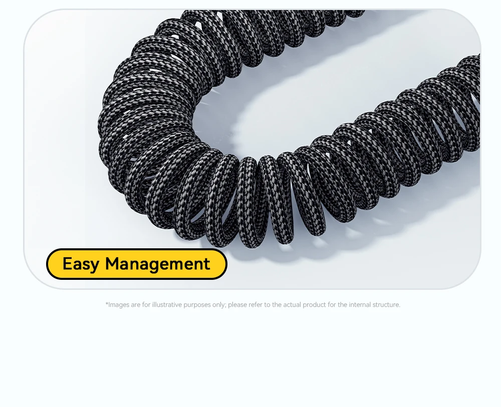 Charge your devices effortlessly on the go with the SugarFlex 100W Fast Charging Cable. Designed with a spring-style coiled design, it stretches when needed and retracts neatly, keeping your car or workspace tidy. Supporting up to 6A high-speed charging, it powers your iPhone, MacBook, iPad, and other USB-C devices quickly and safely.