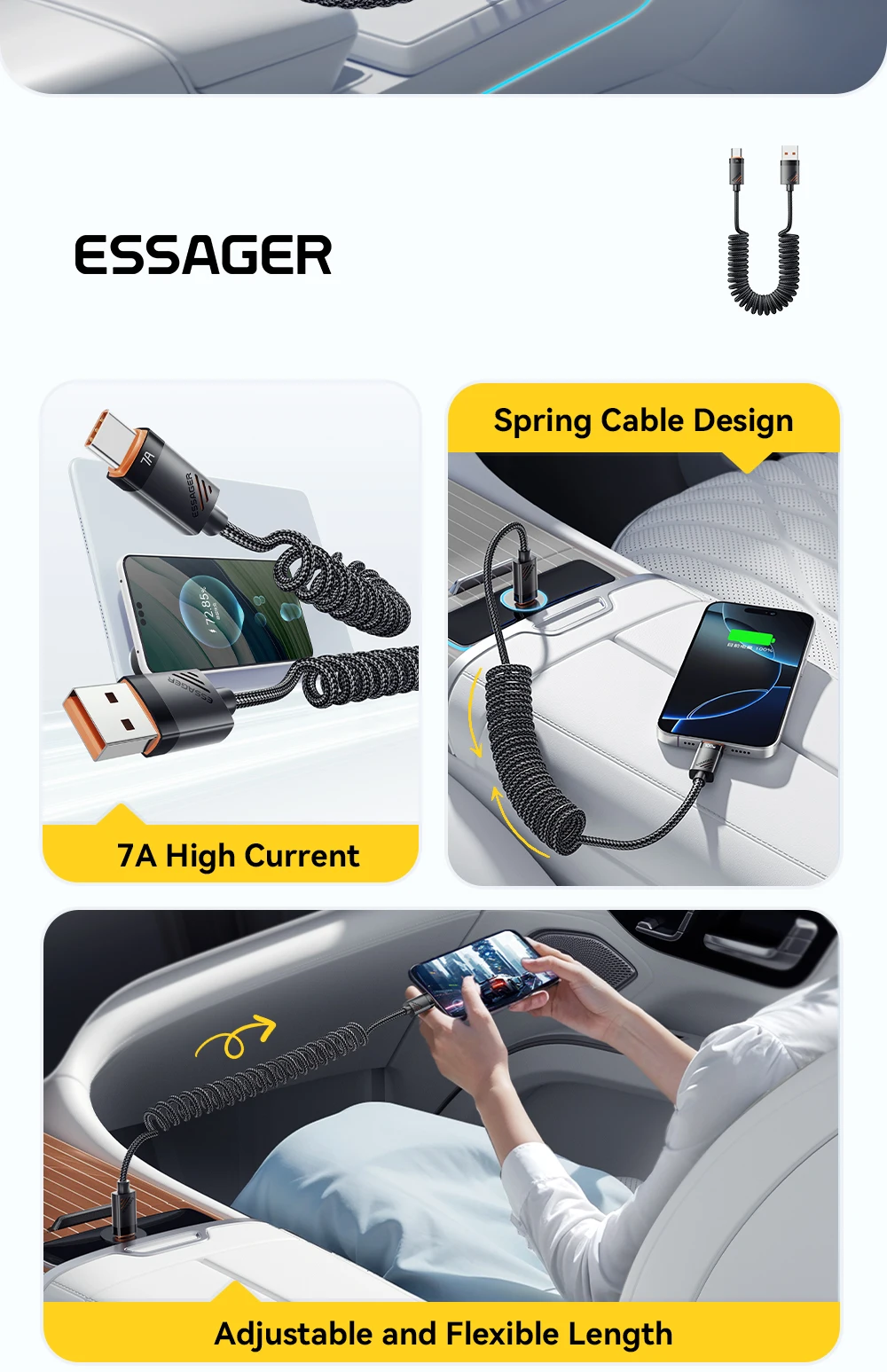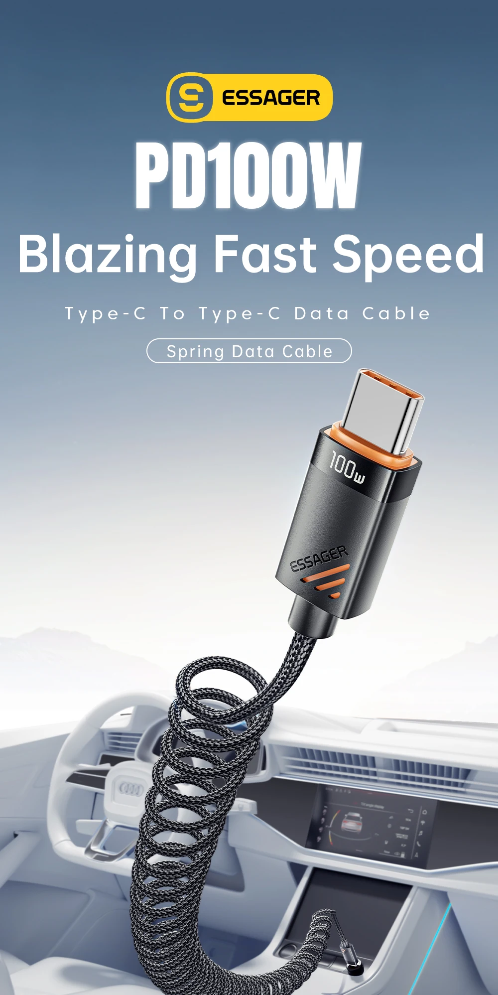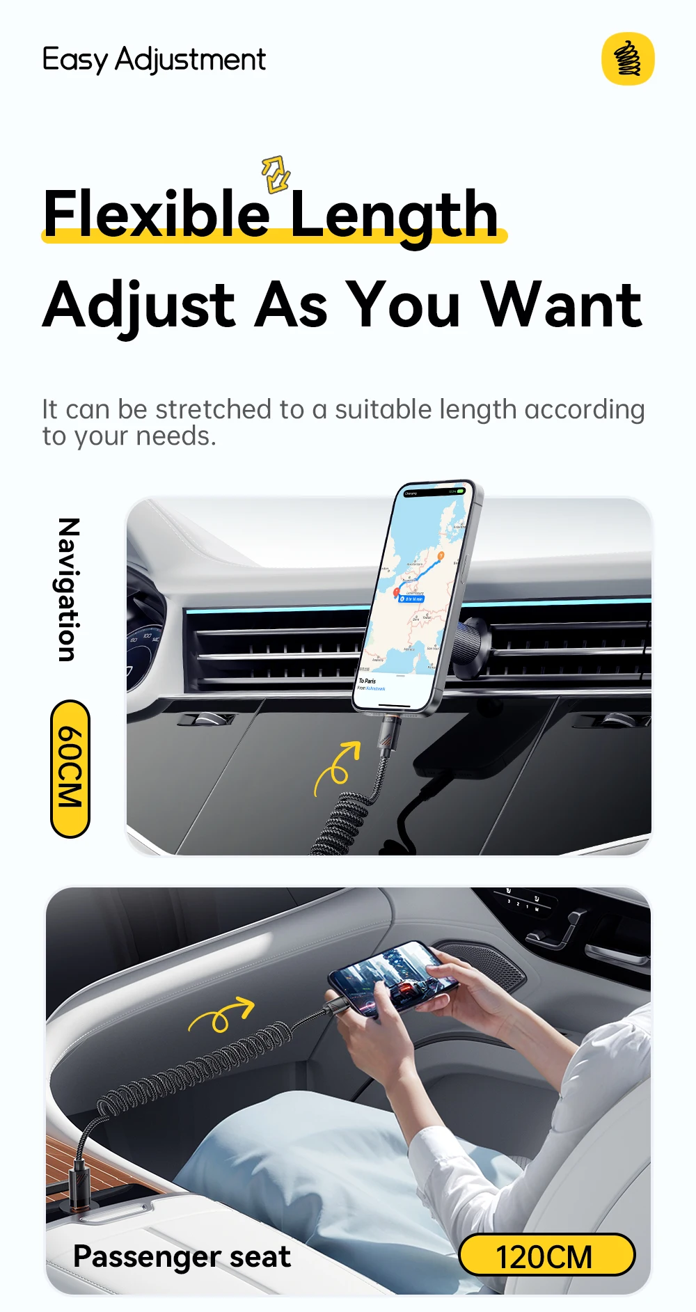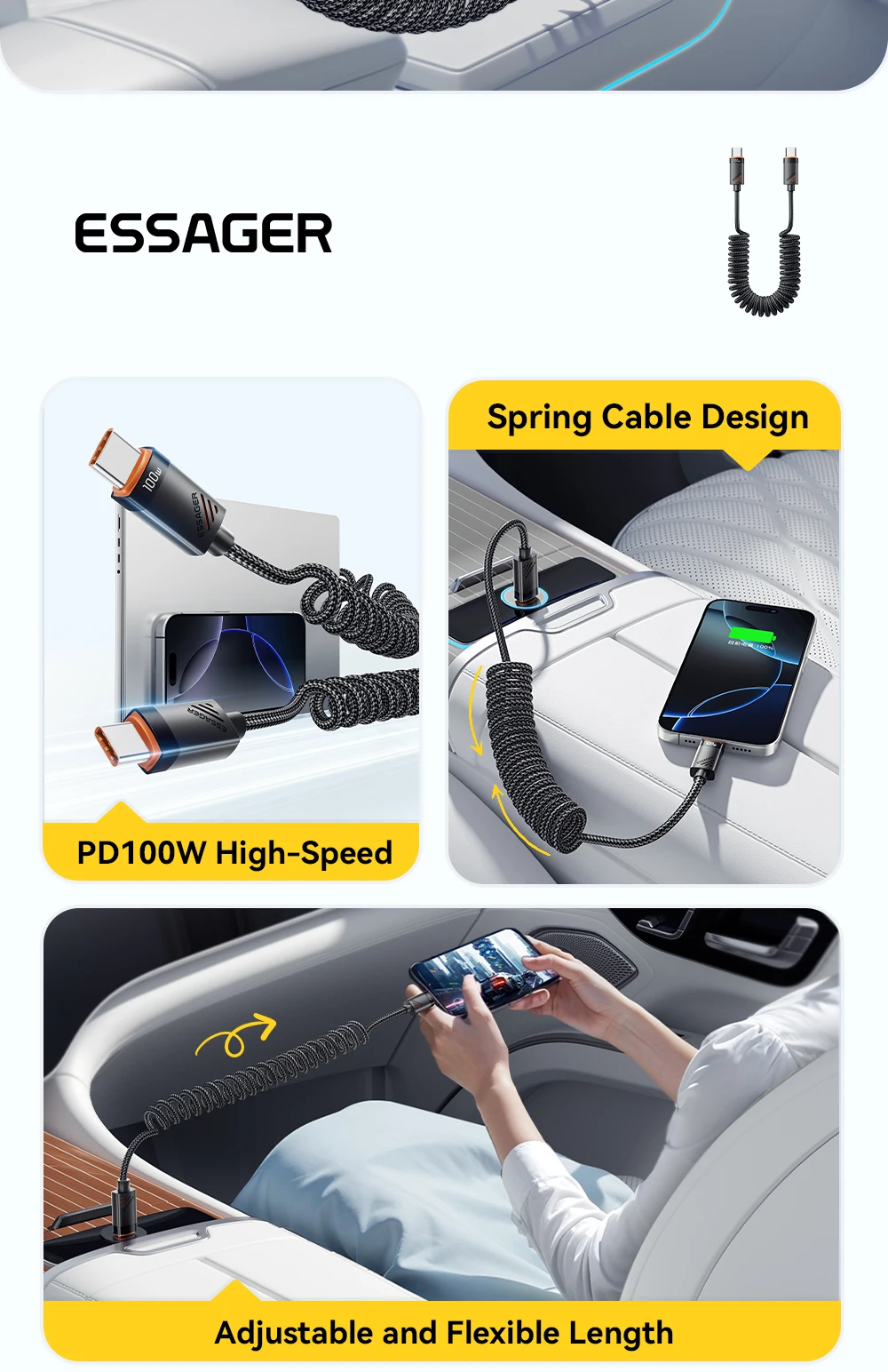 Charge your devices effortlessly on the go with the SugarFlex 100W Fast Charging Cable. Designed with a spring-style coiled design, it stretches when needed and retracts neatly, keeping your car or workspace tidy. Supporting up to 6A high-speed charging, it powers your iPhone, MacBook, iPad, and other USB-C devices quickly and safely.